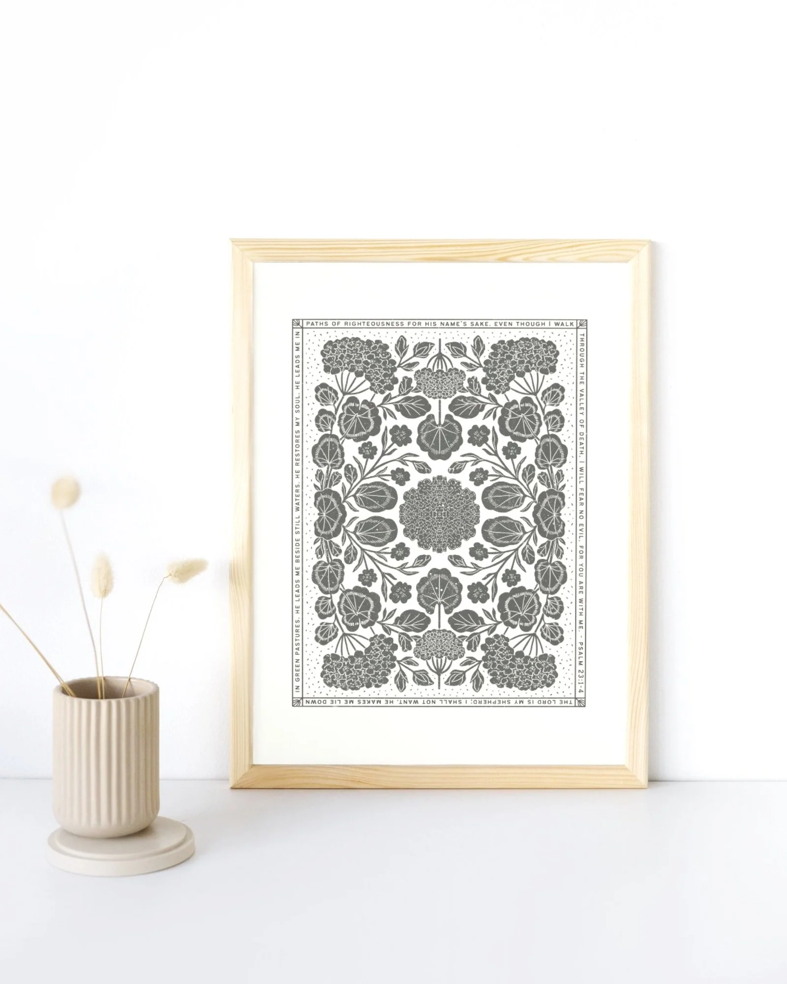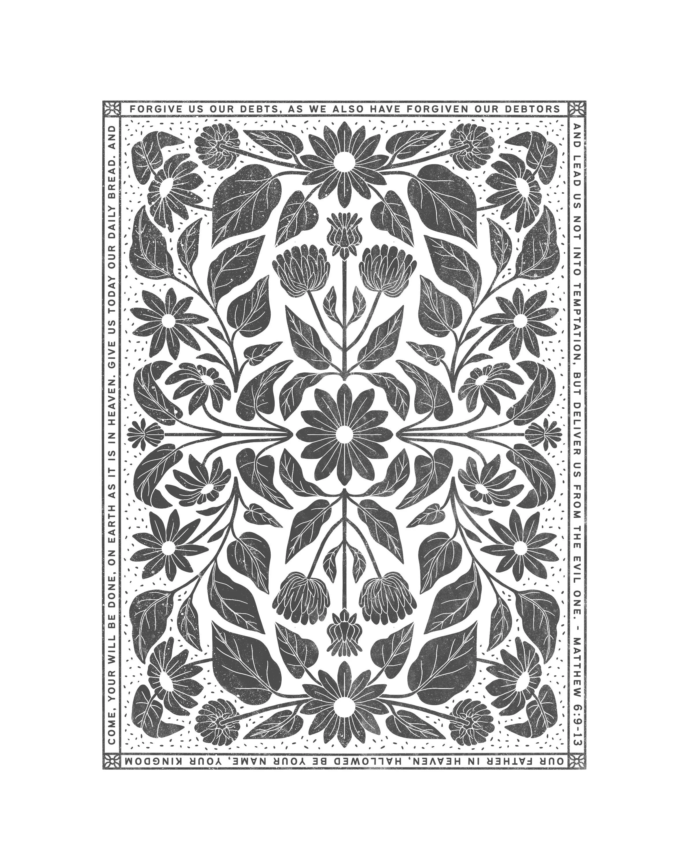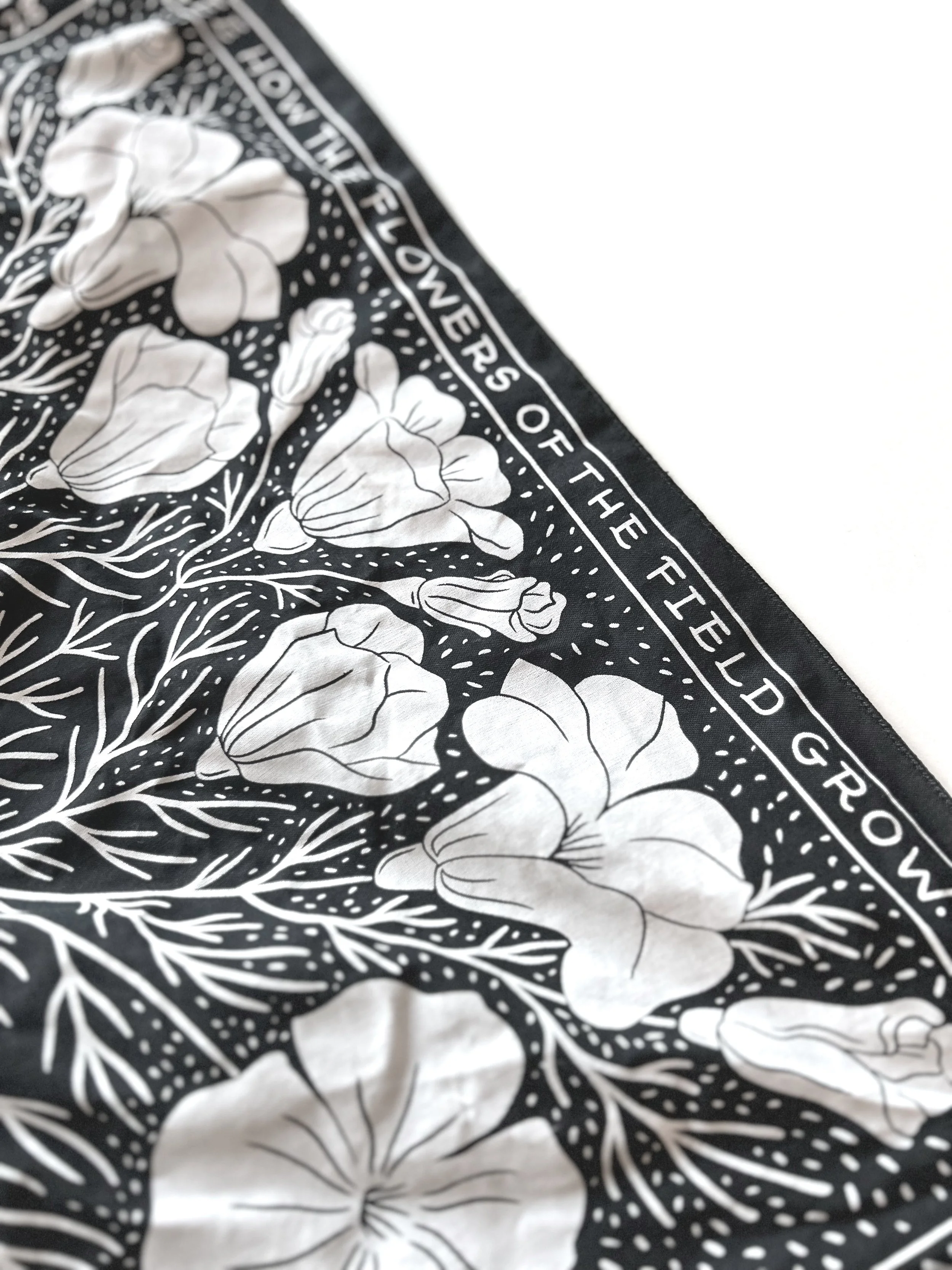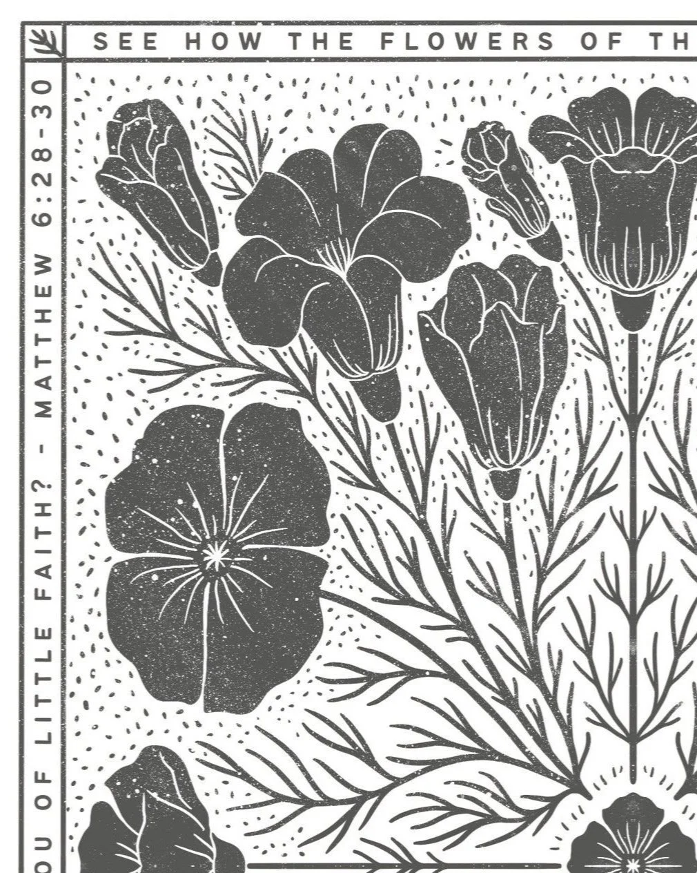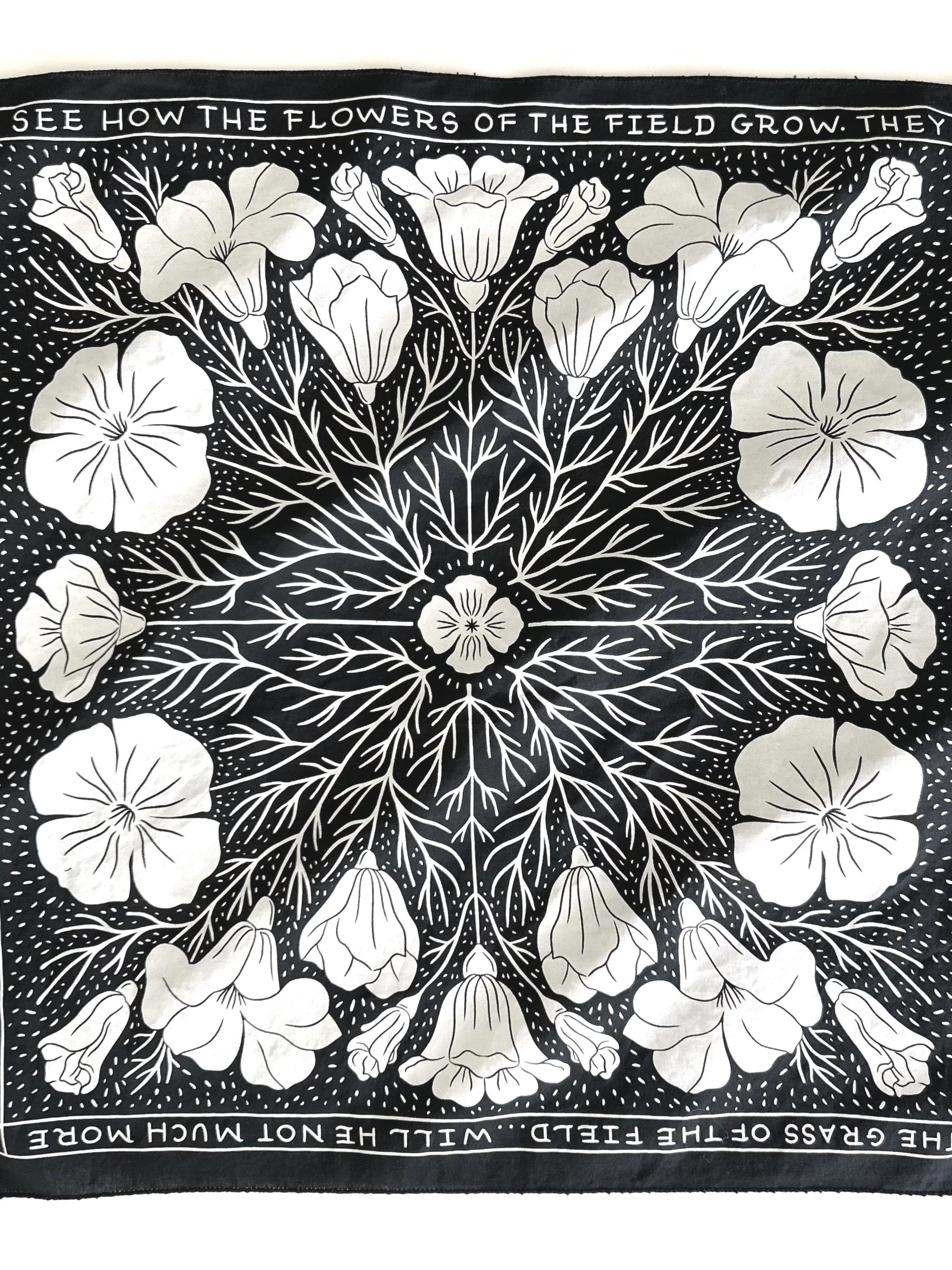 This series of illustrations, originally inspired by a passage of Scripture, feature symmetrical floral designs surrounded by carefully chosen words or verses, adding a deeper meaning and sentiment to the artwork. Whether displayed on a bandana, art print, or greeting card, these designs bring a unique blend of nature-inspired beauty and the power of words to the everyday.