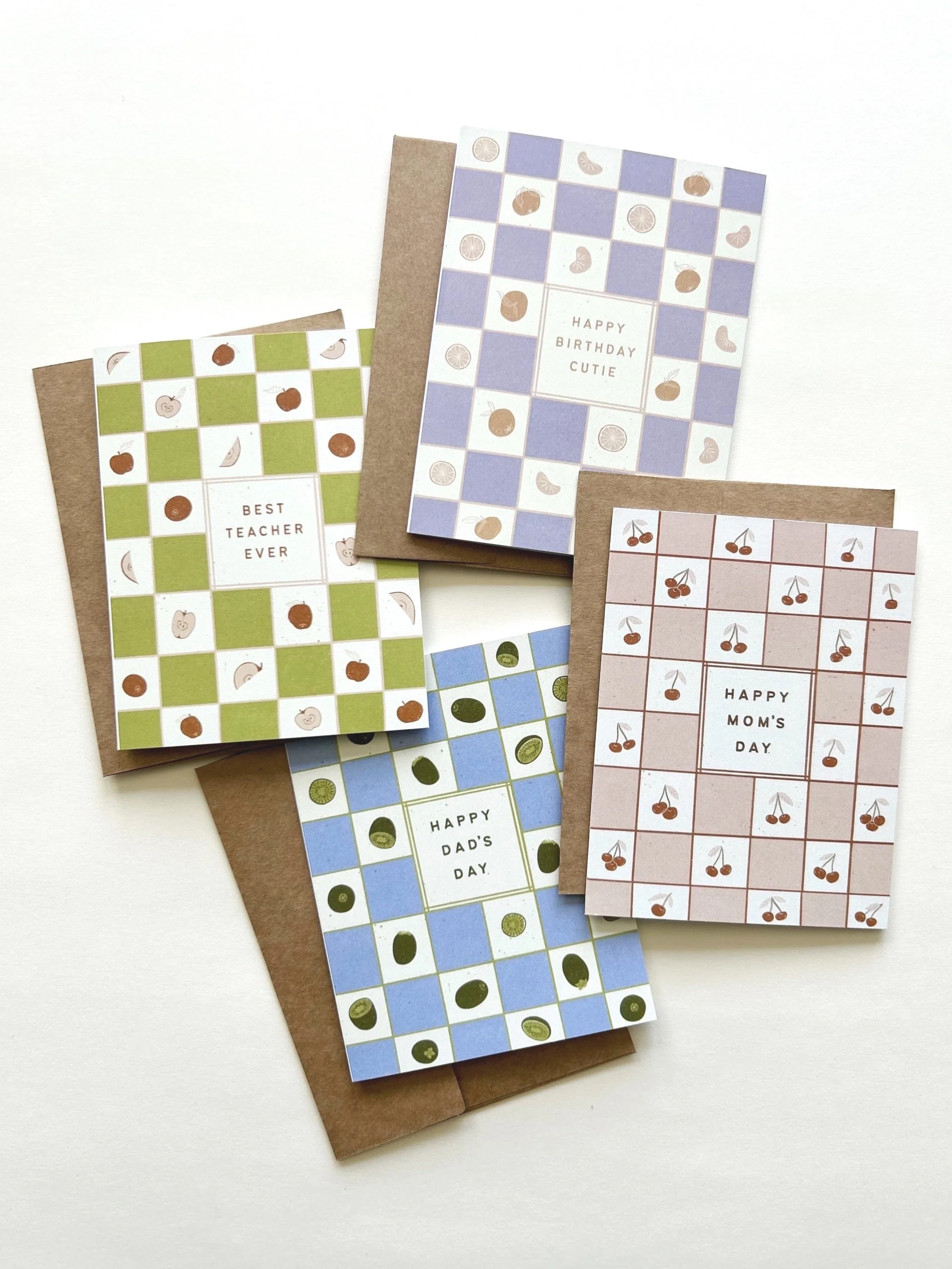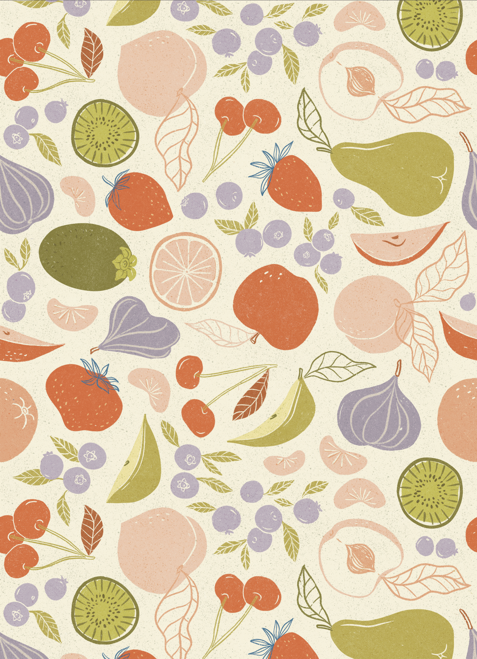 This delightful collection of fruit-themed seamless patterns combine warm, sunny tones with retro-inspired textures to create a sense of joy and whimsy. The patterns add a pop of personality and retro charm to everyday items including a variety of greeting cards, apparel, kid's flashcards, art prints, and notebooks.
