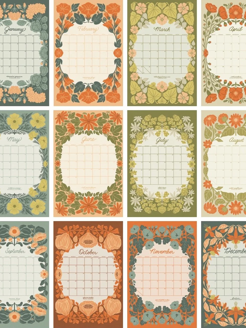 This collection of floral illustrations draws inspiration from the various species of plants and flowers discovered on walks and hikes throughout California. The series are vintage-inspired, whimsical, vibrantly hued drawings are featured on a monthly wall calendar, notebook, planner notepad, and greeting cards.